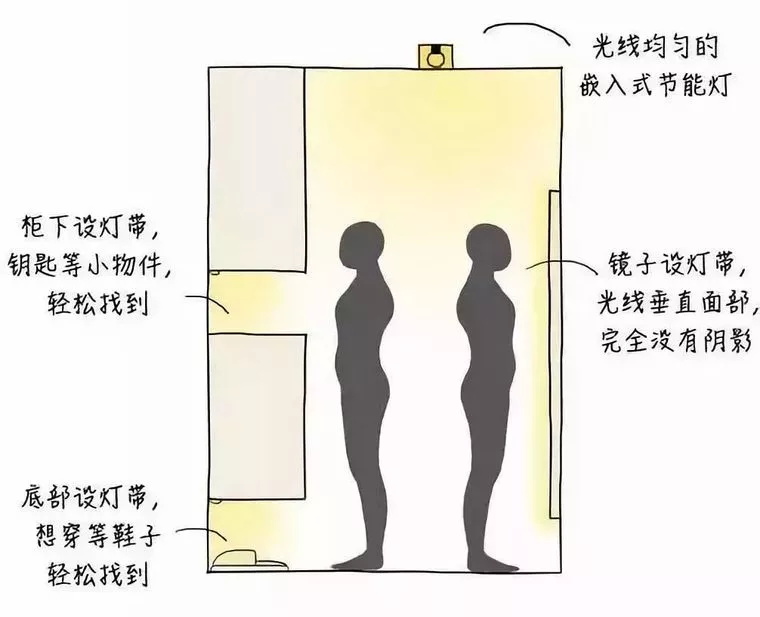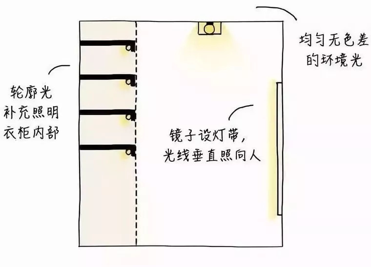 衣柜的局部照明,是為了方便使用者在打開衣柜時,能夠看清衣柜內(nèi)部的情況。衣帽間需要均勻、無色差的環(huán)境燈,鏡子兩側(cè)設(shè)置燈帶,衣柜和層架應(yīng)有補充照明。最好選用發(fā)熱較少的LED產(chǎn)品▼