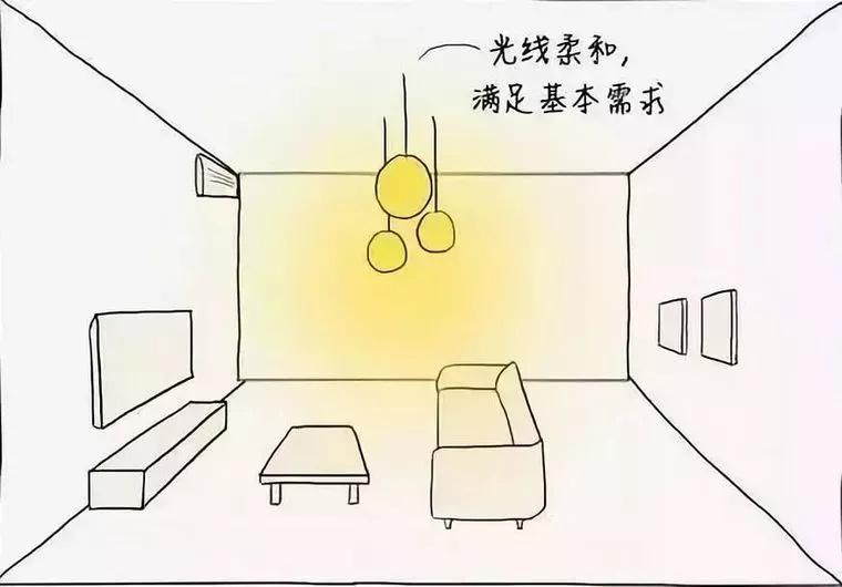 一般人都會想,房間只要夠亮就行了,于是就出現(xiàn)了下面這種“一盞熒光燈or吸頂燈走天下”的死板場景 ↓