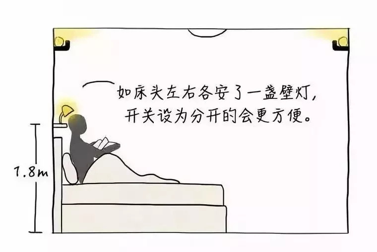 枕邊的局部照明是為了讓人在床上進行稅前活動和方便起夜設(shè)置的??梢栽诖差^距地約1.8m的兩段墻壁,安裝不占空間的壁燈?;蛘咴O(shè)置床頭柜臺燈或者落地燈也可以▼