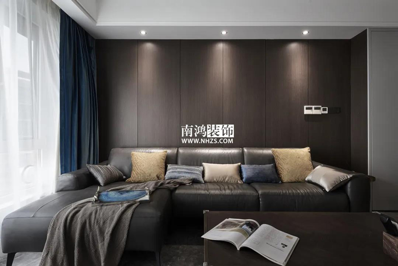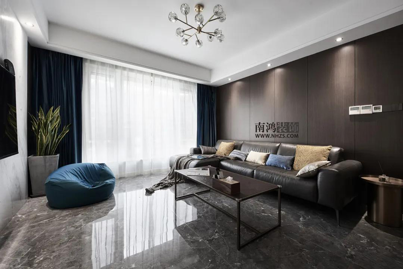 客廳通鋪石紋地磚,黑色皮質(zhì)沙發(fā)搭配方形現(xiàn)代茶幾,背景墻選用大面積KD板包覆,使得整體風(fēng)格簡(jiǎn)潔明快,大氣爽朗。