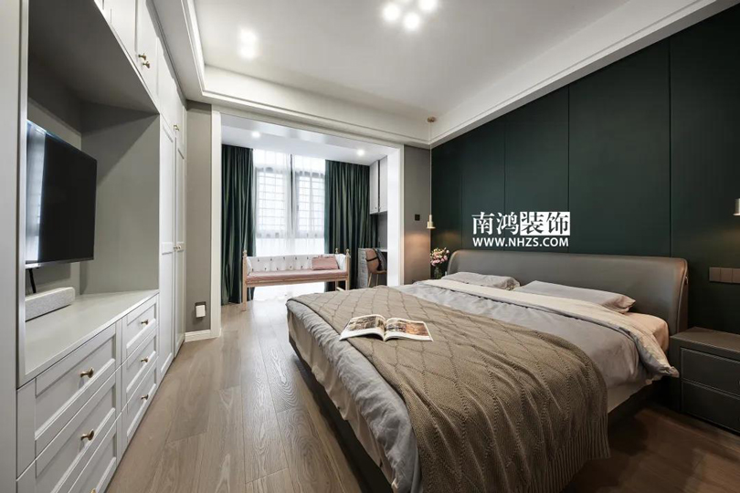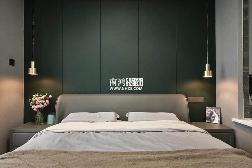 主臥內(nèi)包進(jìn)陽(yáng)臺(tái),增加采光,額外劃出了一塊休閑與工作的地方。室內(nèi)背景墻采用墨綠色硬包,結(jié)合棕色的床品,營(yíng)造放松而舒適的休息環(huán)境,兩側(cè)的金屬材質(zhì)吊燈點(diǎn)綴出小輕奢格調(diào)。