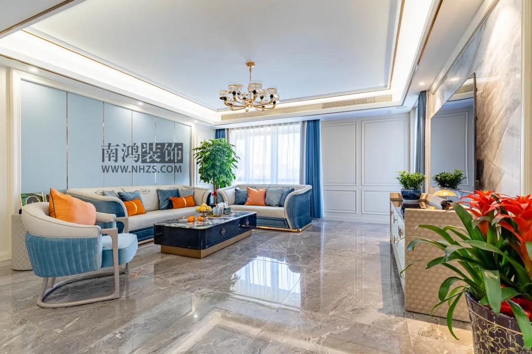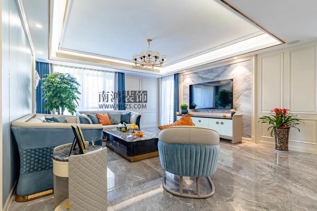 客廳的地面選用深灰色拋釉磚,大理石材質的電視背景墻與之呼應。大面積藍色系的運用,使客廳空間透出清爽自然的氣息,背景墻、吊頂和家具中都加入了金色元素,透出優雅輕奢的味道。