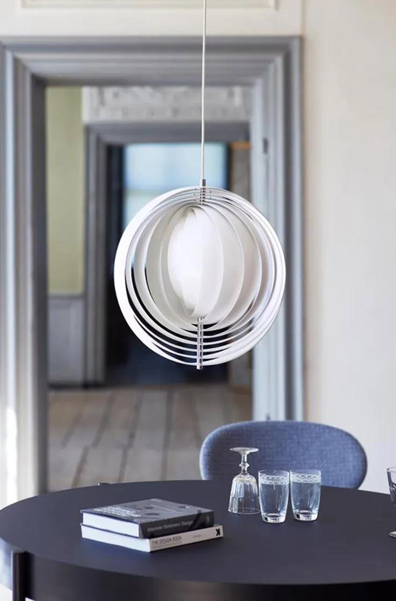 吊燈是Verpan Moon,金屬材質(zhì)的弧形板條像扇子一樣排列組合,這盞燈曾在《神探夏洛克》里出現(xiàn)過。