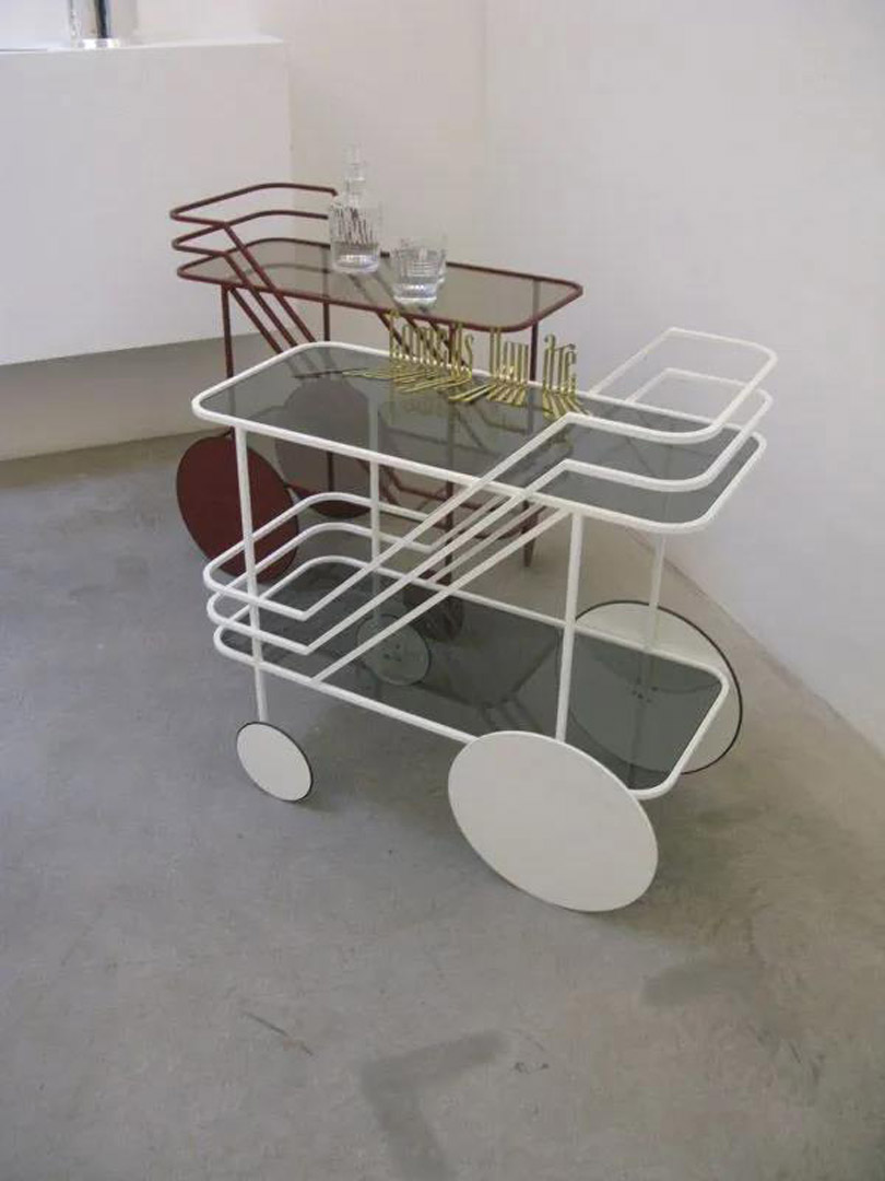 島臺和餐桌之間的過道很寬,除了吧臺凳,還擺了一個紅色酒車,這款酒車來自小眾家居品牌DANTE-Goods And Bads,是盧森堡設(shè)計(jì)師Christophe de la Fontaine的作品。