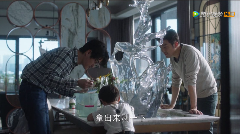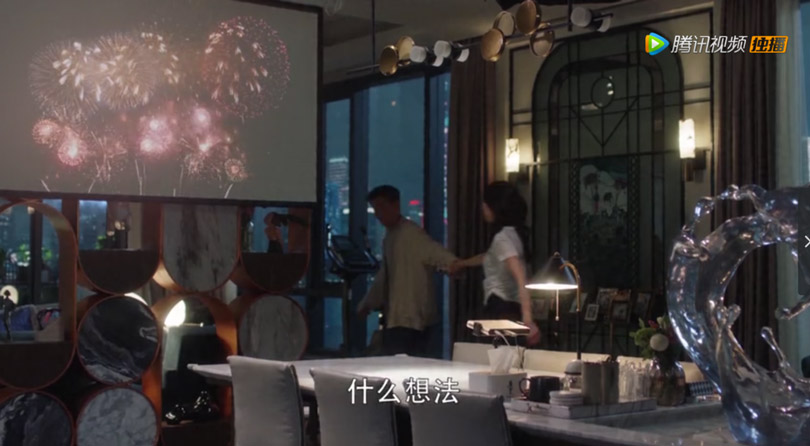 餐廳最夸張的設(shè)計(jì)是超長的大理石餐桌,一半用作就餐,一半做了一個淺水槽,槽內(nèi)布了一個超大的琉璃雕塑風(fēng)水局,因?yàn)樗f物,顧家是做煙花生意的,喬遷的時候不能過火盆,這個風(fēng)水局能讓生意風(fēng)生水起。