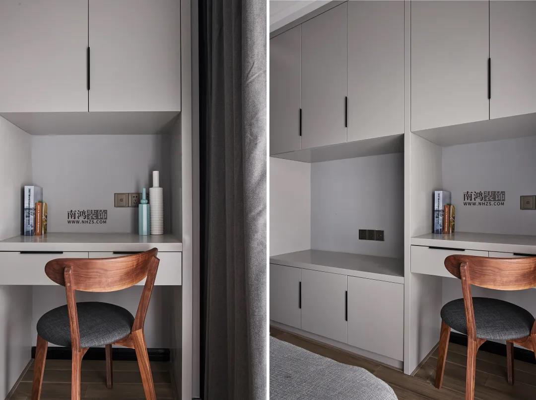 次臥以不同階度的灰色打造,色調(diào)統(tǒng)一的同時(shí)又巧妙劃出了層次,一角黑白塊樣式的小幾替代了床頭柜,是個(gè)小亮點(diǎn)。