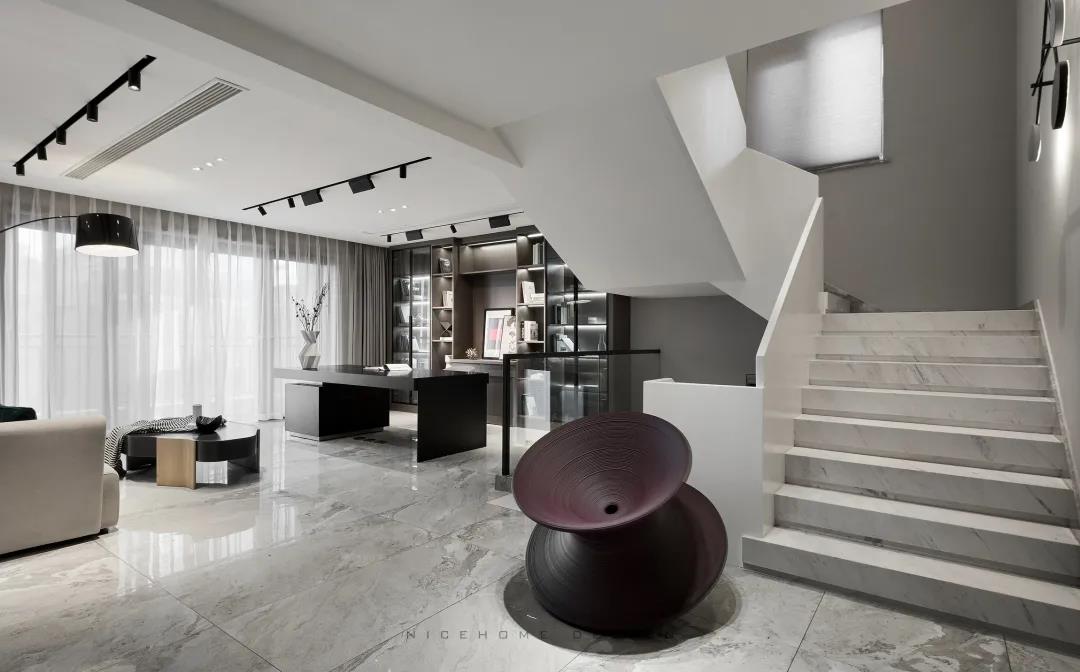 一層原結構樓梯位置不合理,處于入戶正對口,現移動至西側以規避缺陷。客廳主沙發后做一面凌空隔斷墻,增加視覺層次與進門后的儀式感。