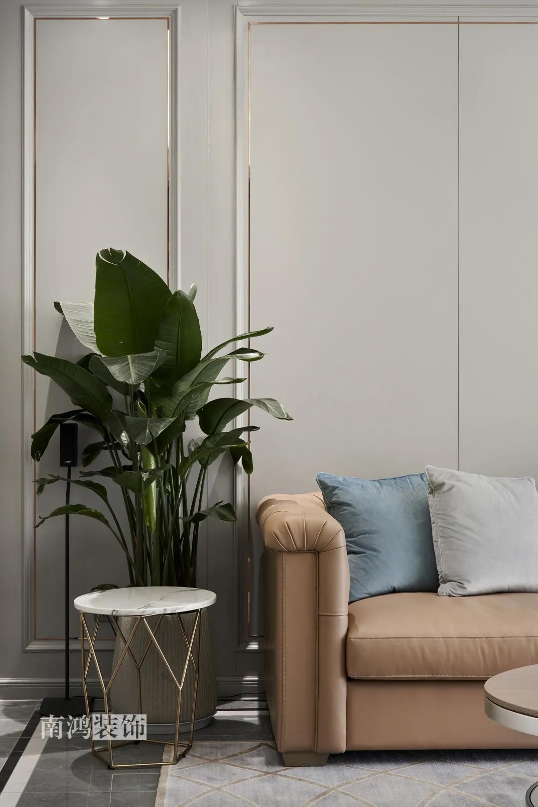 沙發(fā)背景墻是全屋統(tǒng)一的木做護墻添加入金色不銹鋼線條,淺棕色的主沙發(fā)平衡空間情緒,溫和視線。