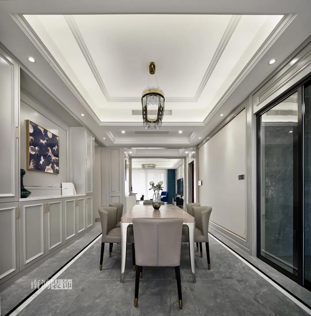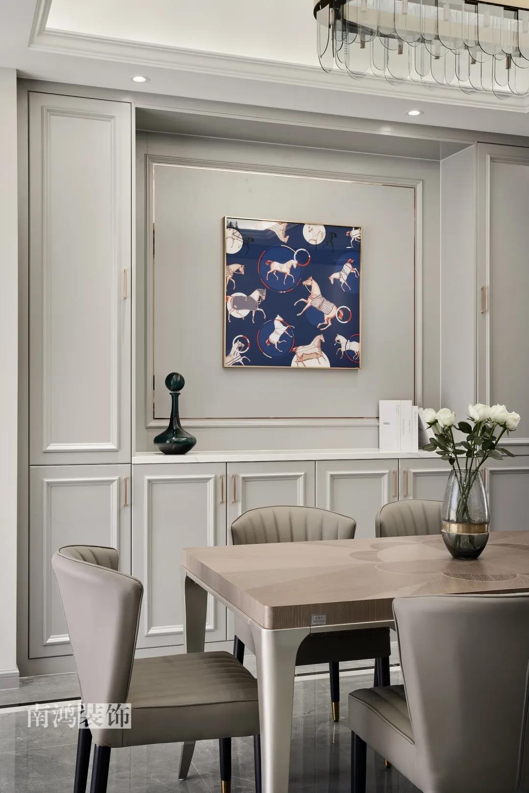 本案在硬裝上采用全屋護墻板,組合上不銹鋼線條,呈現(xiàn)非常有質(zhì)感有層次的輕奢細節(jié)。張弛有度的設(shè)計處理,強化了對空間框架和秩序的知覺,為屋主營造出頗具儀式感的生活氛圍。