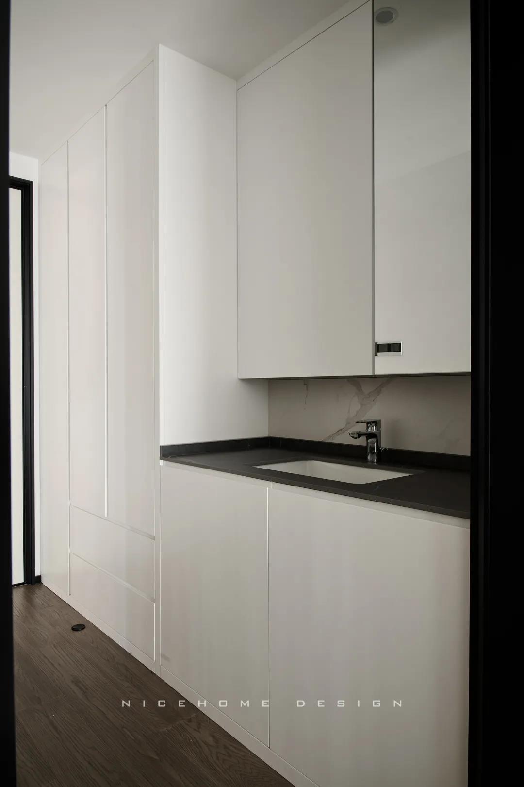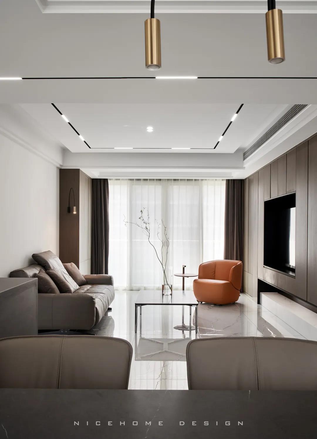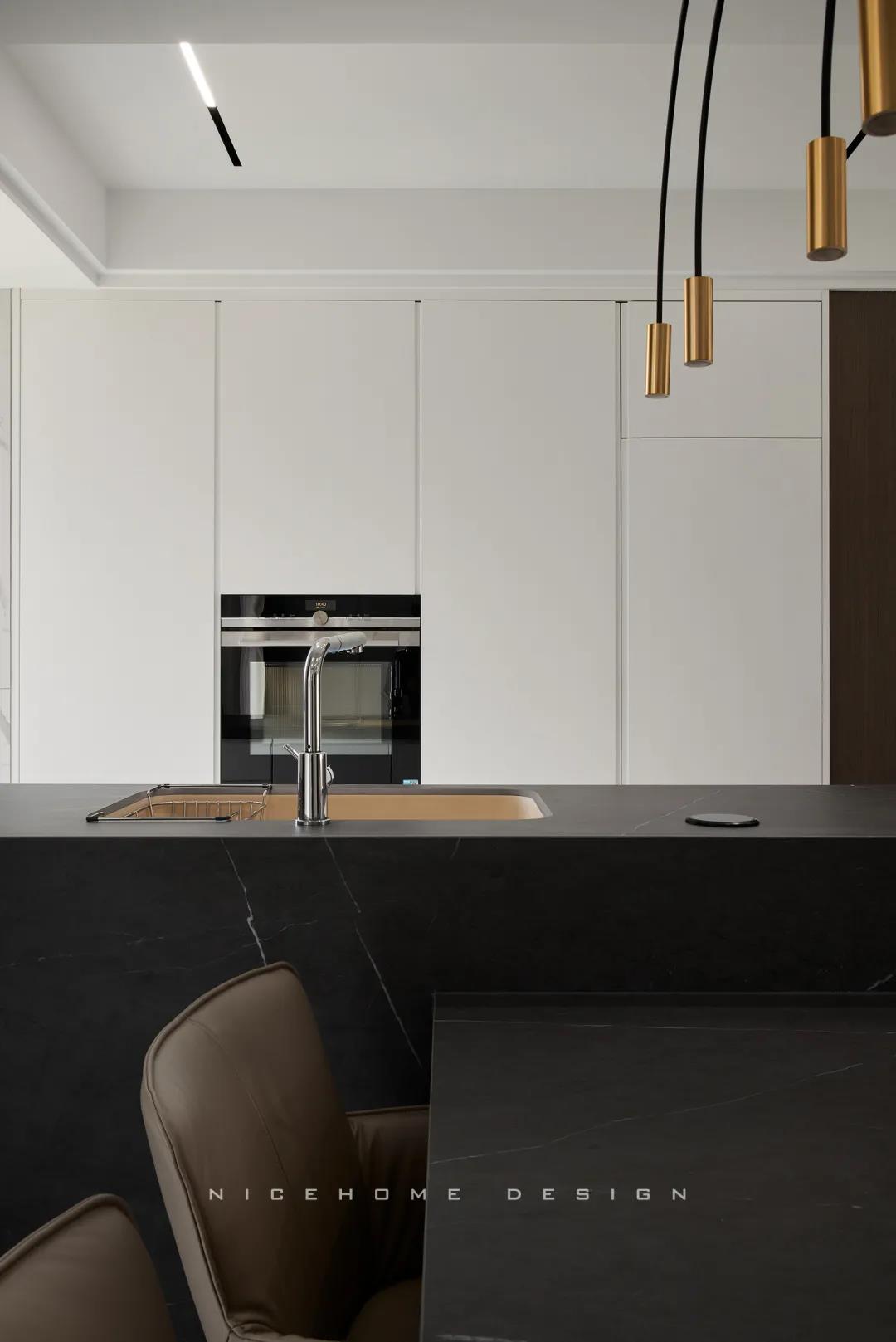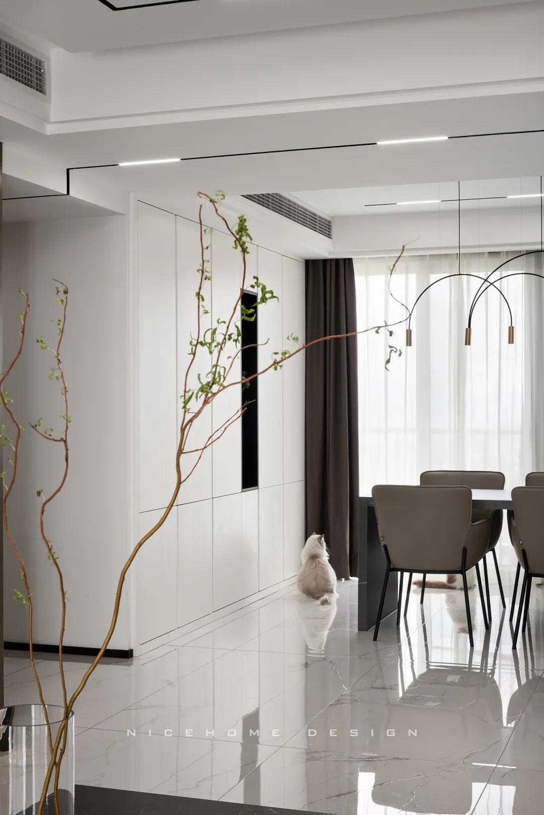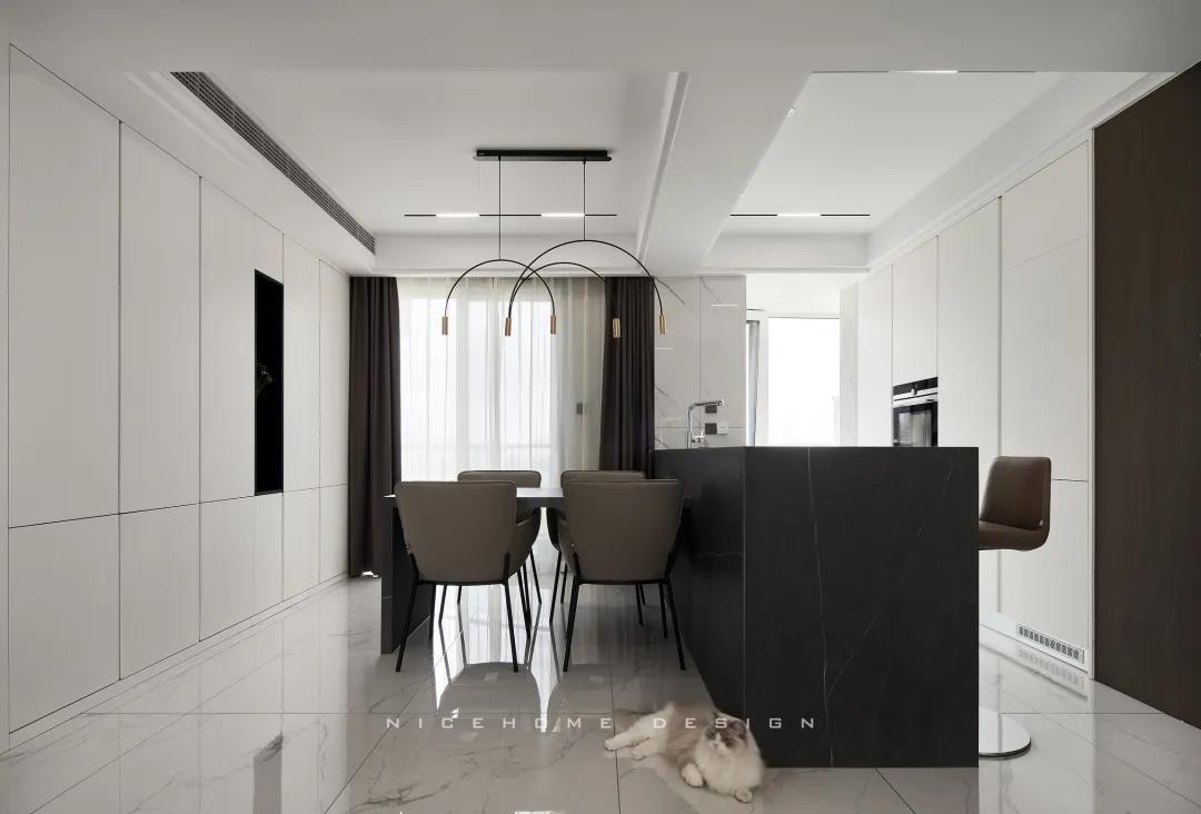 Quiet Time 本案以現(xiàn)代簡約風(fēng)格為主旨,潔凈的配色、高級感的家具材質(zhì),以及巧妙的空間序列規(guī)劃,再加上通透寬敞的開放式布局,令整體空間在理性的架構(gòu)中傳達(dá)著現(xiàn)代主義的美學(xué)觀感。 ? 案例信息 地址:天鴻君邑 戶型:兩室兩廳 面積:145㎡ 風(fēng)格:現(xiàn)代簡約 設(shè)計(jì)施工:浙江南鴻裝飾 ? 戶型分析 屋子是超高層建筑,一方面承重結(jié)構(gòu)比較多,能動(dòng)的墻體有限,另一方面采光通風(fēng)非常好。 主要是把原來的入戶花園改為了廚房,這樣原來的廚房就可以作為西廚和餐廳的一部分,解決了功能上的需求也讓餐廚區(qū)更寬敞。 走廊型玄關(guān),與內(nèi)里的過道無縫銜接,加上燈線的拉伸,視覺延展性極強(qiáng)。左手墻面留白,右手邊做深木色的收納柜提供合適的收納空間。 空間遵循現(xiàn)代簡約的架構(gòu)模式,主色調(diào)由明凈的白和溫潤的木組成,淡然含蓄,幾根萌發(fā)綠意的小枝椏點(diǎn)綴出自然空靈的氣息。 電視背景墻做整面的柜體,地臺取代電視柜的位置,與上方柜體拉開一定距離,削減了一定厚重感。茶幾臺面選擇巖板材質(zhì),四四方方的造型含規(guī)整有序之意。 局部放置一把橙色單椅,讓視覺更富有生機(jī),搭配置物小邊幾,閑暇時(shí)光的閱讀、喝茶也有了好去處。 屋子采光極好,開放式格局進(jìn)一步放大優(yōu)點(diǎn),光線灑入空間,成為天然的柔光濾鏡。明朗有序的線條,搭建起主人向往的現(xiàn)代品質(zhì)生活。 餐廚空間進(jìn)行重新規(guī)劃后,餐廳與西廚合為一體,兩側(cè)白色高柜充分利用空間,把收納效率提到極致,極簡銑槽柜門無把手,讓視覺保持統(tǒng)一干凈。 一體成型的黑色巖板餐桌結(jié)合西廚島臺,塑造空間純粹內(nèi)斂的高級質(zhì)感,清冷有型之中悄然散發(fā)出精致韻味。 步入主臥,過道一側(cè)將衛(wèi)生間干區(qū)與收納柜結(jié)合,類似酒店式的布局,干凈清爽。操作臺面周圍做擋水條,可以很好地防止濺水。 主臥內(nèi)部利用陽臺拓展使用空間與視覺深度,同時(shí)讓更多的自然光線進(jìn)入房間。背景墻留白,絳紫色絨布床頭詮釋著優(yōu)雅,陽臺處擺放主人的健身器械方便早起運(yùn)動(dòng)。 衣庫位于主臥與次臥中間做統(tǒng)一收納,柜門使用長虹玻璃隔斷,結(jié)合柜內(nèi)燈光所呈現(xiàn)的若隱若現(xiàn)的朦朧感,超絕!