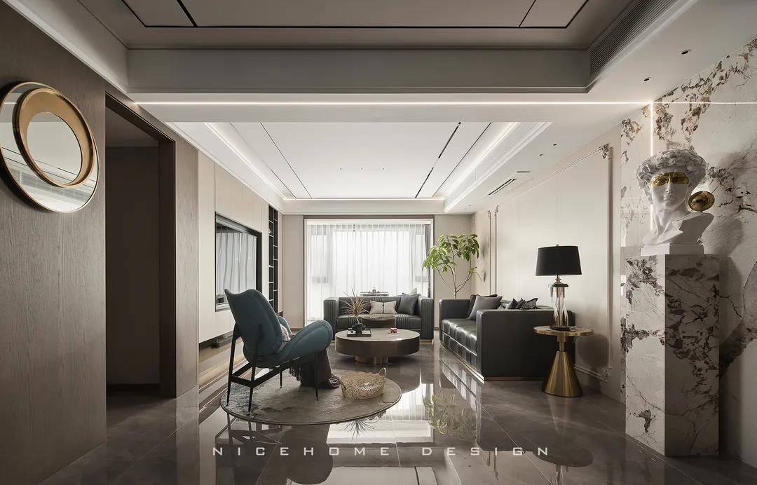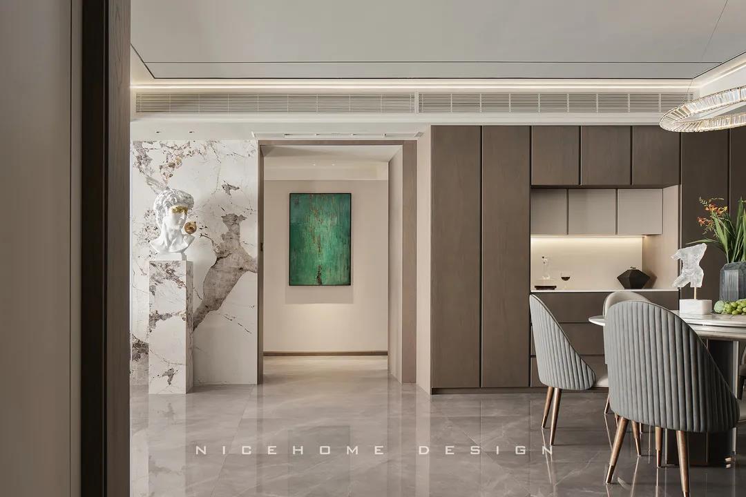 【項目·信息】 地址 | 盛世天城 城市 | 中國 寧波 戶型 | 四室兩廳 面積 | 185㎡ 風(fēng)格 | 現(xiàn)代輕奢 設(shè)計施工 | 浙江南鴻裝飾 主要用材 | 格萊美瓷磚、邁菲樂地板、杜拉維特衛(wèi)浴、洛華隆櫥柜、美萃家具、南鴻美家軟裝等 關(guān)于本案 About The Design 今天為大家?guī)硪惶赚F(xiàn)代輕奢風(fēng)格新作,男女主人均為小學(xué)老師,女兒十歲,常住人口為三名。他們希望家首先是要實用,有盡可能多的收納空間,其次有較高審美需求,在空間表現(xiàn)上希望溫馨舒適又不失藝術(shù)格調(diào)。 溫和與沉靜是這個家的主調(diào),開闊的空間擁有著優(yōu)越的采光與視野。穩(wěn)重的大地色配合大理石、金屬、皮革、棉麻等多種材質(zhì),極富力量和層次。 空間布局張弛有度,木飾面溫潤的色澤將暖意帶入其中,以“靜”為名的藝術(shù)妙筆記錄下生活的美好,打造一個生活美學(xué)與藝術(shù)氛圍相互平衡的居住領(lǐng)域。 關(guān)于戶型 About The House Type ▲原始結(jié)構(gòu)圖 ▲平面設(shè)計圖 01. 客廳 Living Room 客廳是一個采光良好的方正大空間,明朗、大氣,穩(wěn)重的大地色烘托溫和而親切的人文氣質(zhì)。 頂面黑色不銹鋼和磁吸軌道燈形成線條延伸感,增加了視覺層次。沙發(fā)背景植入小法式護墻混搭,與大衛(wèi)雕塑組合,為空間注入靈動與格調(diào)。自過道口頂端特意拉出一道折線燈帶,勾勒個性的藝術(shù)氣場。 壁掛電視與收納背景合而為一,外觀利落整潔。儲物柜精準(zhǔn)分配開閉比例,收放自如之間,穩(wěn)妥了實用機能,協(xié)調(diào)了日常節(jié)奏,讓設(shè)計感恰到好處。 空間平鋪的溫厚色澤以穩(wěn)重低調(diào)的問候與居者發(fā)生情感碰撞,含蓄內(nèi)斂兼具東方美學(xué)韻味,一呼一吸之間將溫度與關(guān)懷深入人心。 陽臺處設(shè)計品茶區(qū),清冽的茶香伴著溫煦日光,縈繞此間的只有言笑晏晏的自在感受... 02. 餐廳 Dining Room 餐廳與客廳以過道為界,餐桌椅均線條簡練卻不乏精致細節(jié),一側(cè)大體量餐邊柜用于收納諸多雜物,空出的操作臺日后可擺放一些小家電,方便制作簡餐。 03. 廚房 Kitchen 廚房櫥柜選擇與公區(qū)域同種溫和色系,搭配灰色墻地磚,視覺得到統(tǒng)一,空間更顯明亮潔凈。 04. 過道 Corridor 過道懸一幅尺寸適中的掛畫,詩意的綠色剛好與背景墻大理石肆意灑脫的紋理相映成趣,賦予空間別樣的張力。 05. 臥室 Bedroom 主臥之內(nèi)所流動的情感,溫暖而真誠。藝術(shù)感與生活感交融,營造出親切而閑適的氛圍,分分鐘便能撫平主人一天的疲憊。 床尾斗柜延伸出梳妝臺區(qū)域,綠植、畫作、小雕塑,共同圍構(gòu)出一角小小的藝術(shù)天地。 客臥的氣質(zhì)同樣雅致非凡,光線流連入內(nèi),盈盈散發(fā)著溫潤平靜的質(zhì)感。右上角的個性掛飾就像是懸浮在半空中的月亮,讓夜晚充滿浪漫的情調(diào)。 06. 兒童房 Children's Room 以馬卡龍粉為主色調(diào)的女兒房,睡眠區(qū)、學(xué)習(xí)區(qū)、休閑區(qū)、收納區(qū)被有序安置,保障孩子能夠擁有一個完善的成長環(huán)境。房間內(nèi)也有許多孩子喜愛的童趣元素,看,墻上這只頭戴小花的兔兔是不是就特別地可愛呢~ 自然親膚的面料給予孩子最大的舒適感受。 07. 書房 Study 書房,沒有任何多余的裝飾,書桌椅+大書柜的配置便已足夠日常的辦公、學(xué)習(xí)使用,轉(zhuǎn)角飄窗也被妥善利用起來,作為閑適一角。 08. 衛(wèi)生間 Toilet 衛(wèi)浴干濕分離,懸空式設(shè)計的原木儲物柜與臺盆柜足以滿足收納之需,視覺上也更加輕盈不添負擔(dān),保留一份簡單純粹。