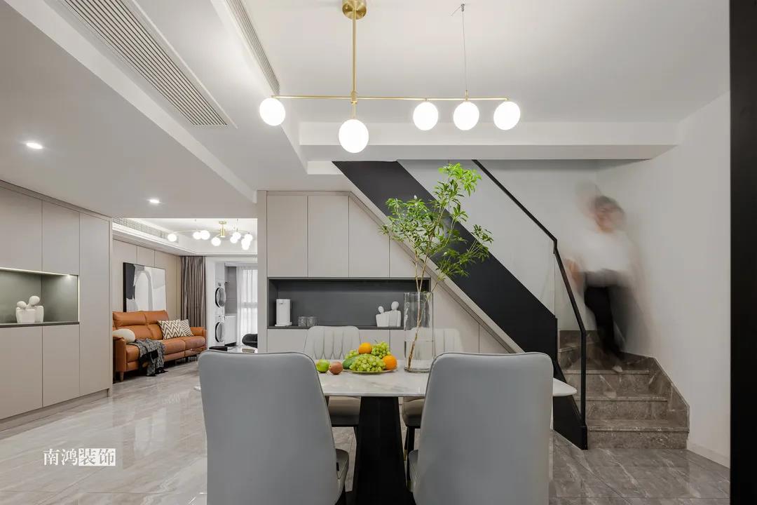 本案是一套現代輕奢風格的復式作品,業主夫妻二人,暫無小孩子,房間上除主臥之外,保留了兩個次臥做父母房和兒童房,一樓寬敞通透的開放式公區域設計成為本案一大亮點。 一層集合了日常所有的的煙火氣,蒸箱、烤箱、咖啡機、洗碗機、洗衣機...攜帶著一種隨性的自由,廚房到客廳依次構成白與黑、疏與密、放與收的過渡對比,層次感的疊加形成舒適的視覺體驗。 空間以暖調的木飾面色搭配黑白灰作為整體基調,簡約利落又不失家的溫馨。 戶型分析 ▼ 原始戶型存在一樓空間相對擁擠,樓梯陡峭,走起來費力,二樓空間利用率不高等問題。 1、樓梯位置調整,打造多個收納展示空間。 2、原有結構陽臺納入室內,擴大客廳使用面積和直接采光面。 3、廚房門洞改變方向,消除了原廚房與客餐廳的隔閡,打造一體化、全開放的格 局。 入戶區迎面而來一層開放大格局,往左為客廳,視野通透舒暢。定制儲物柜滿足基本的收納需求,色彩由淺入深,層次清晰分明,滿足功能的同時不失視覺美感。 青草綠點綴出小清新,柜內設計隱藏式燈帶,見光不見燈的效果,簡單一筆勾勒出空間輪廓與光影質感。 客 廳 LIVING ROOM 美觀大方的客廳空間,左右兩側維系著剛剛好的距離,溫和的底色在視覺上減輕了壓迫感。大理石與木飾面結合的電視背景,搭配硬包,皮藝沙發和單椅,顯出輕奢意味。 黑白灰三色搭配的餐廳空間,點綴的金屬材質點亮活力。開敞明亮的用餐環境,兩側都留有足夠大的通道距離,應對日常的社交聚餐可以說毫無壓力。 空間的時尚高級感,除了整體硬裝、家具的造型選擇之外,更重要在于細節的雕琢。由樓梯下來的白凈墻面,除了懸掛常規的裝飾畫外,由黑色線條勾勒的人像圖形也頗有趣味,讓人能感受到一種自在而愉悅的氛圍。 灰色向來是現代感家居的寵兒,沉靜色彩更能凸顯質感。 廚 房 KITCHEN 廚房與餐廳以玻璃門相隔,保持視覺的通暢,U型設計極大地提高空間利用率,洗菜、切菜、烹炒動線流暢,高效下廚輕輕松松。 主臥包入陽臺打造為休閑區,床頭背景清新的淺藍色與床品的灰色、單椅的橙色形成了具有層次感的溫馨格調。 床尾打造女主人的梳妝臺,豎線條裝飾營造縱橫維度的立體感,與留白的墻面相映襯,豐富了主臥空間的現代意象。 休閑陽臺除了一把單椅外,還有造型輕巧的穿衣鏡與掛衣架,生活的小確幸就在一點一滴的細節間把握。 長輩房藏在客廳隱形門背后,不增添過多修飾的空間更加簡約耐看,偶爾來小住的父母也有了私密的休憩之地。 長虹玻璃門引入外部光線,保證衛浴室的明凈感受。壁掛馬桶不留衛生死角,方便日常清潔。黑色的五金件隱隱占據視覺主導,將利落的現代感盡可能放大。